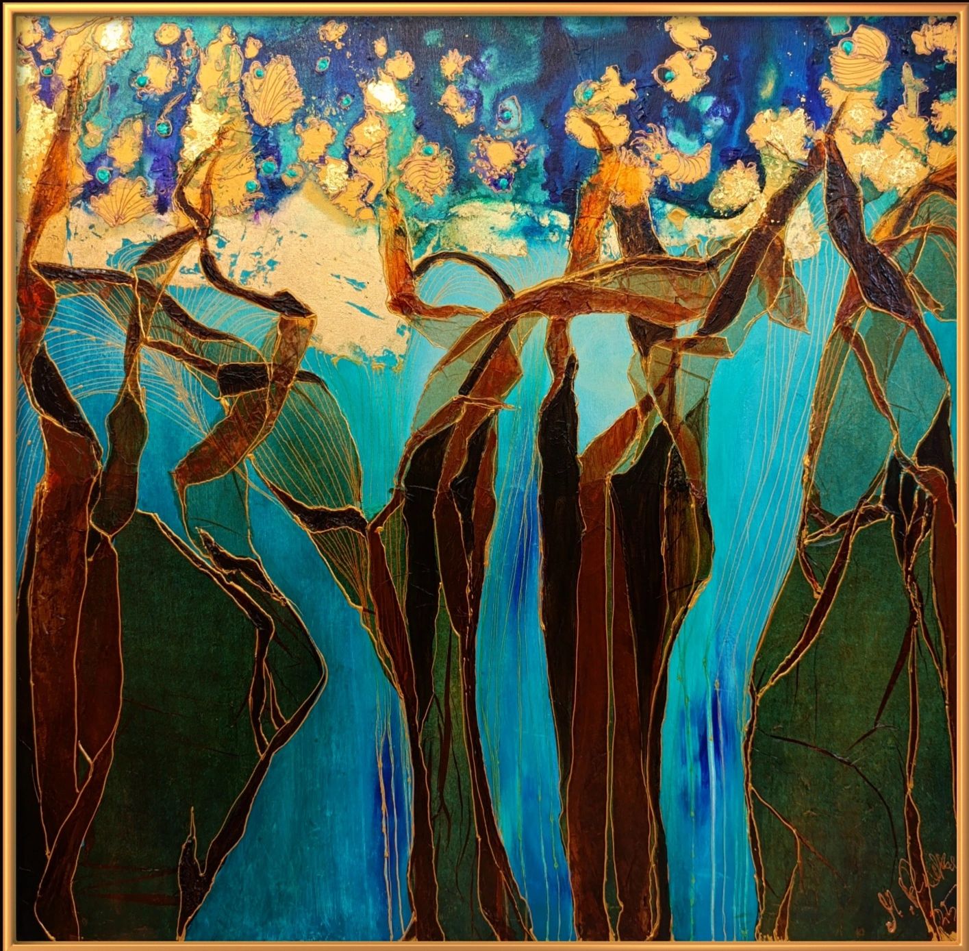 "Bursztynowe wodorosty" collage, technika mieszana, własna, rozmiar 80/80 cena 2000pln